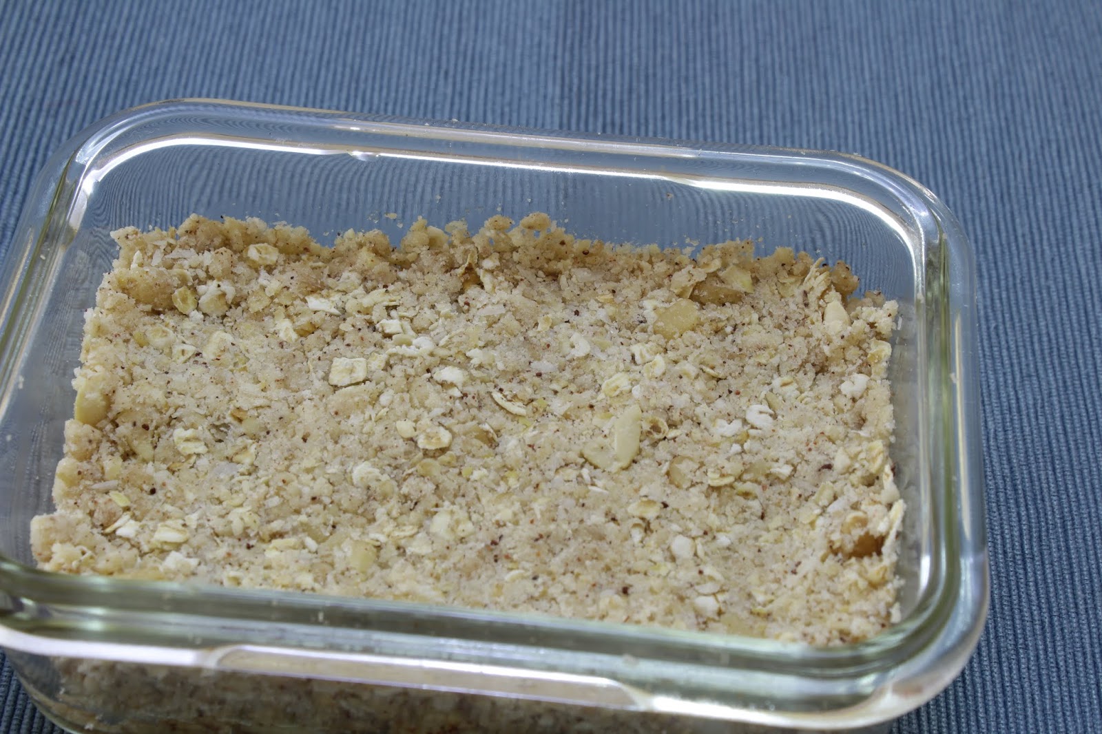• To make the crumble mix the plain flour, oats, desiccated coconut , nuts,butter, cinnamon powder and sugar in a bowl.