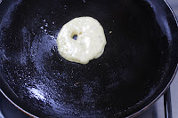 - Dip each apple roundel into the batter and lay on the hot griddle to sizzle .