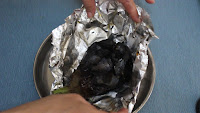 - After 10-15 minutes open the foil paper and peel off skin from the brinjal.
