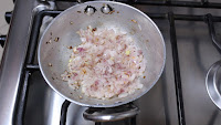 - As the brinjal is sitting wrapped in the foil , saute the onions in kadai with 2-3 tbsp oil.