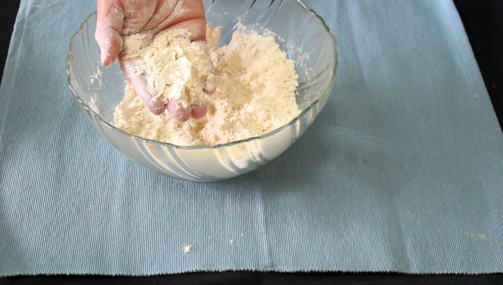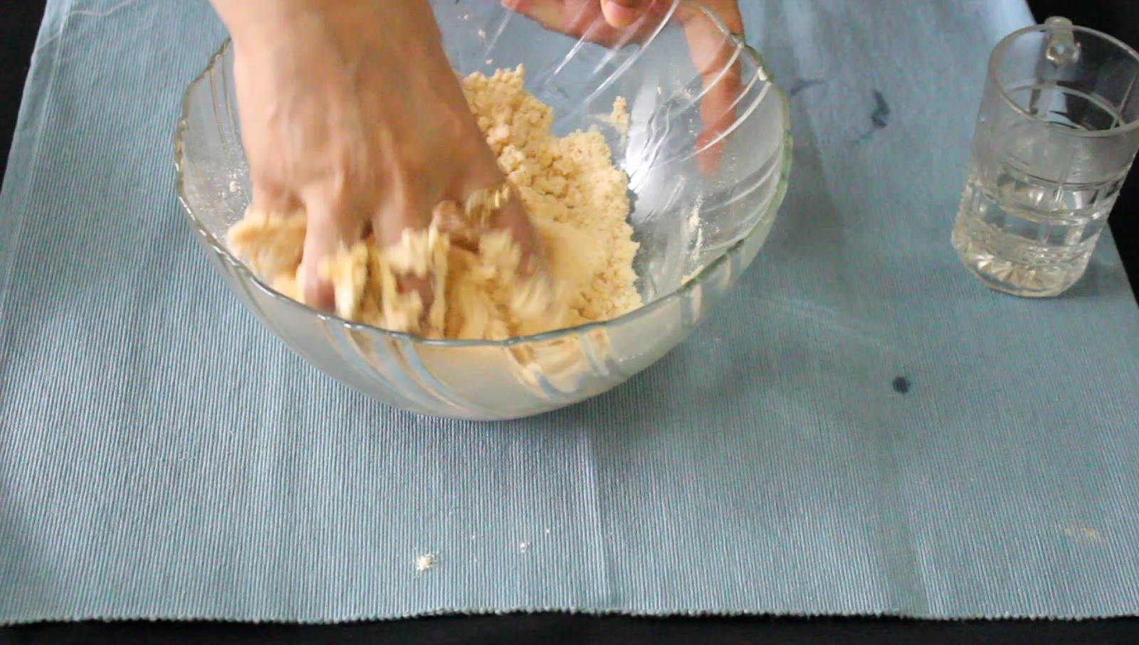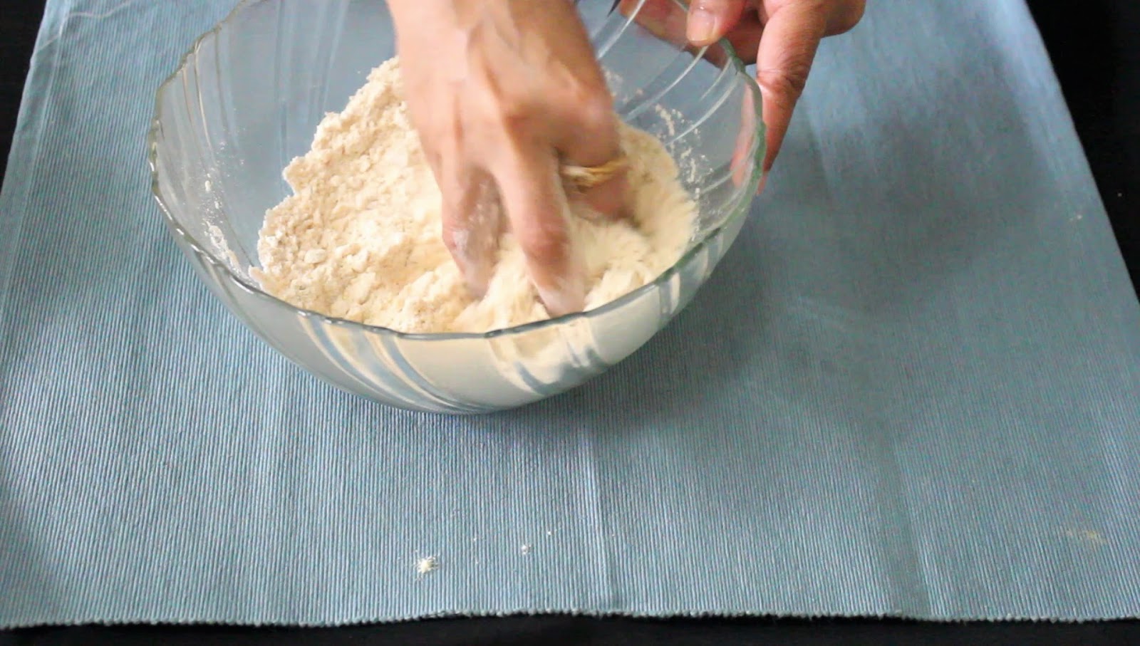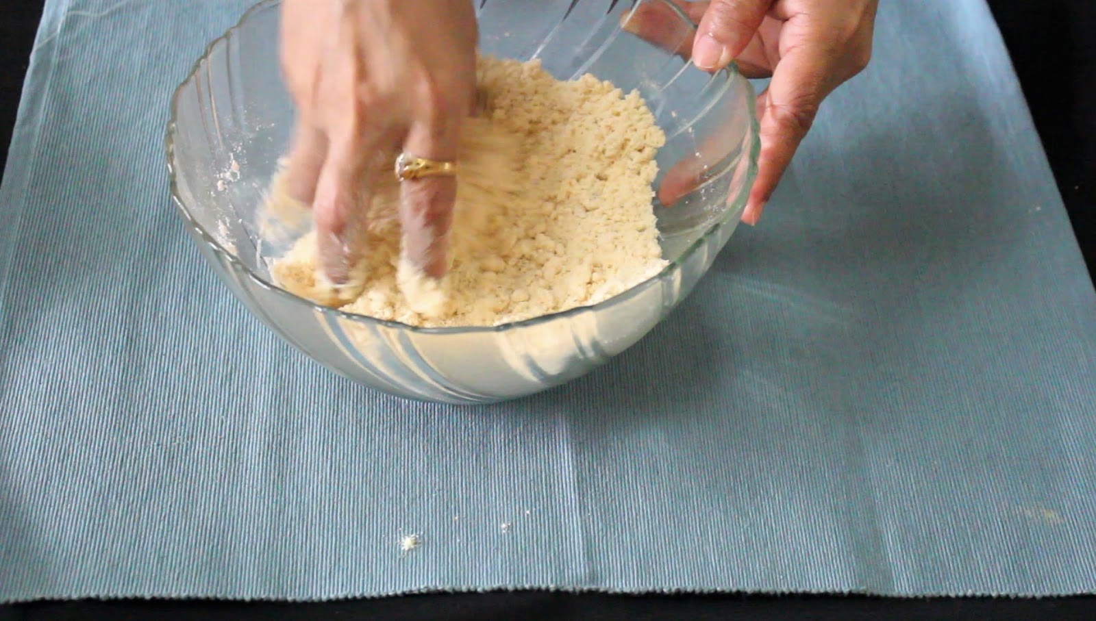 2. Add warm butter  to the flour mixture and rub until flour mix resembles crumbs.