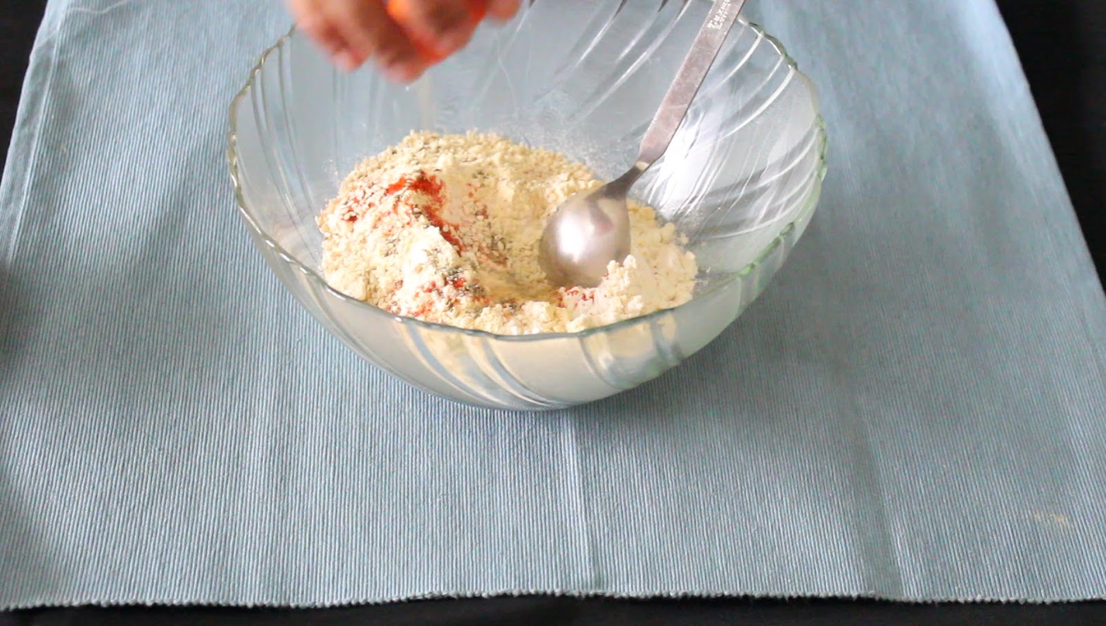 1. Add in the salt, red chili powder, ajwain (carom seeds),  white sesame seeds, hing (asafoetida) Mix until well combined.