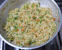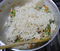 6.  Add the noodles , soy sauce onions and salt. Stir fry