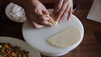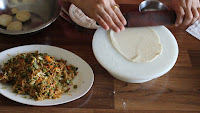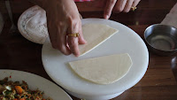 1. Apply water on the edges of each half of sheet. From one sheet two samosas are made