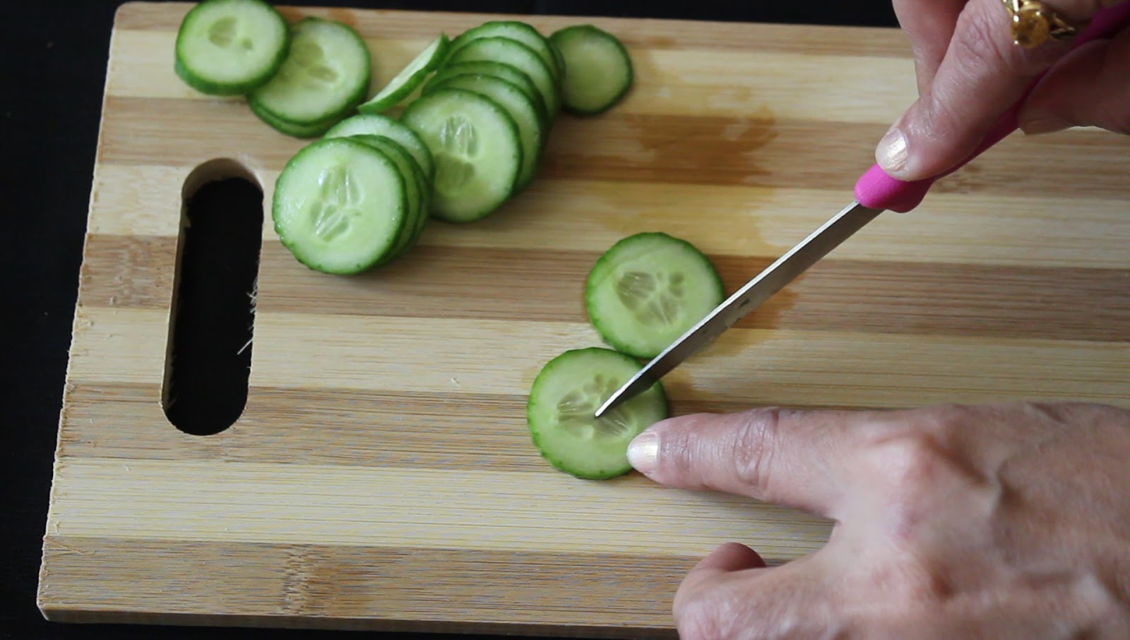 - Cut thin round cucumber slices.