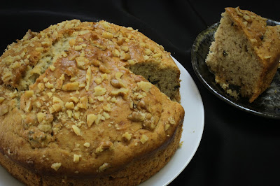 Eggless Banana Cake recipe is a quick and easy recipe that gives a light  and soft cake. Whenever you have slightly  over ripe bananas in your house, use them in this cake recipe. Im sure you will be delighted at its  flavour and outcome. This cake has become one of the most loved cakes of our family. Now no more will you find any unattended over ripe bananas in the fruit bowl of our dining area. Moreover, the dash of cinnamon and nutmeg takes this cake to the next level. Simply divine...No one will ever believe that this soft and moist cake does not contain eggs!