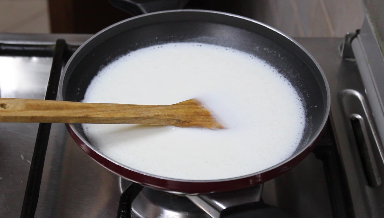 Add sugar to 2 cups milk and bring to near-boil. Reduce flame.