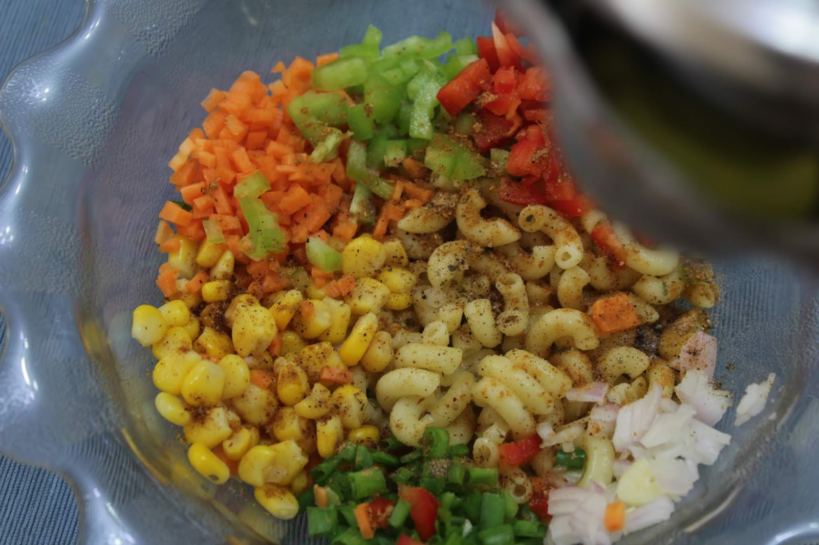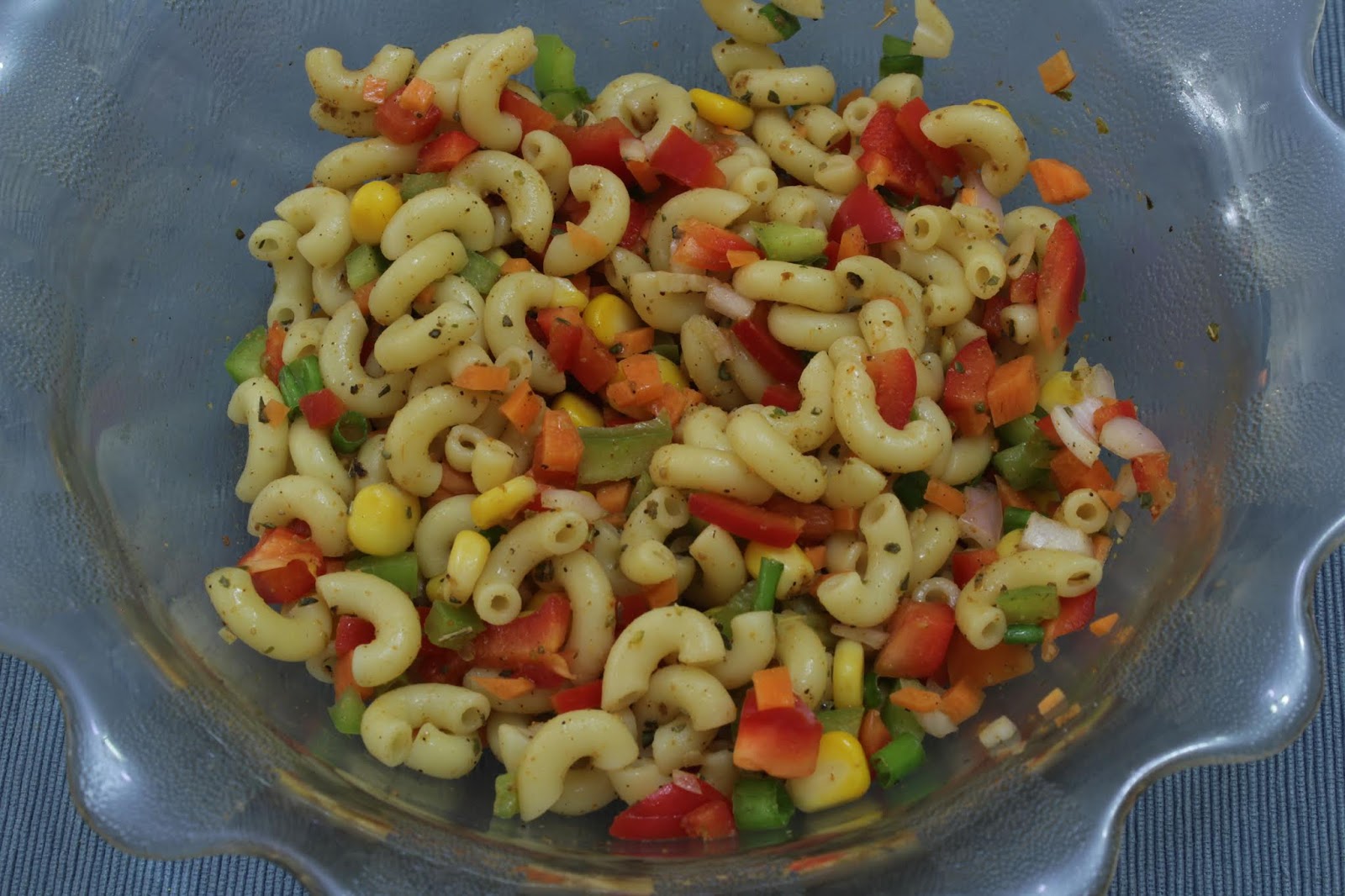 - To the macaroni add all the remaining ingredients – corn, capsicum, carrot, scallion, vinegar, lime juice,salt, chaat masala, crushed black pepper and olive oil.