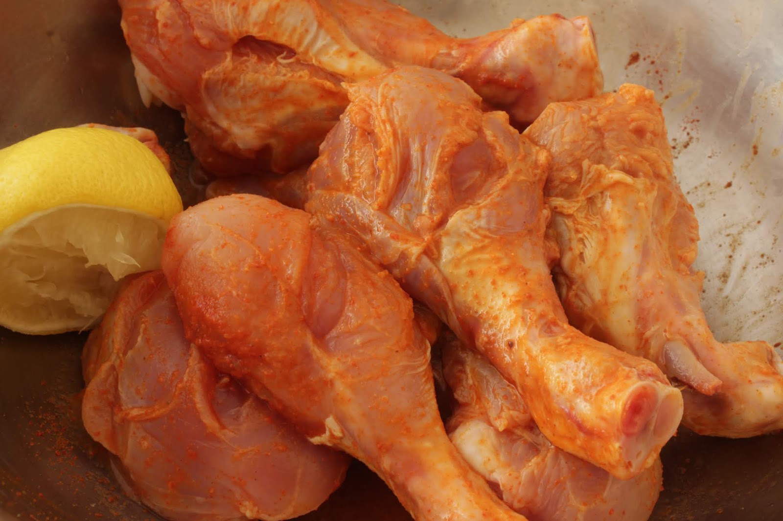 - First Marinade: Rub the chicken drumsticks with salt, chilli powder and lemon juice . Keep aside for 10-15 minutes