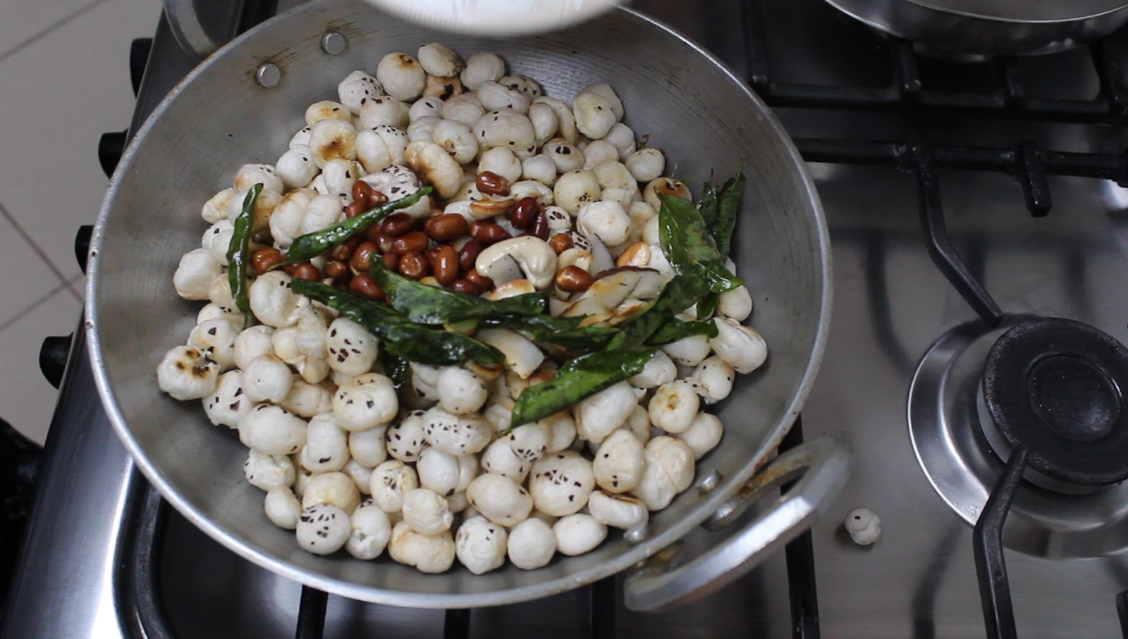 - Add the makhanas. Also add the fried curry leaves, peanuts and coconut slivers.